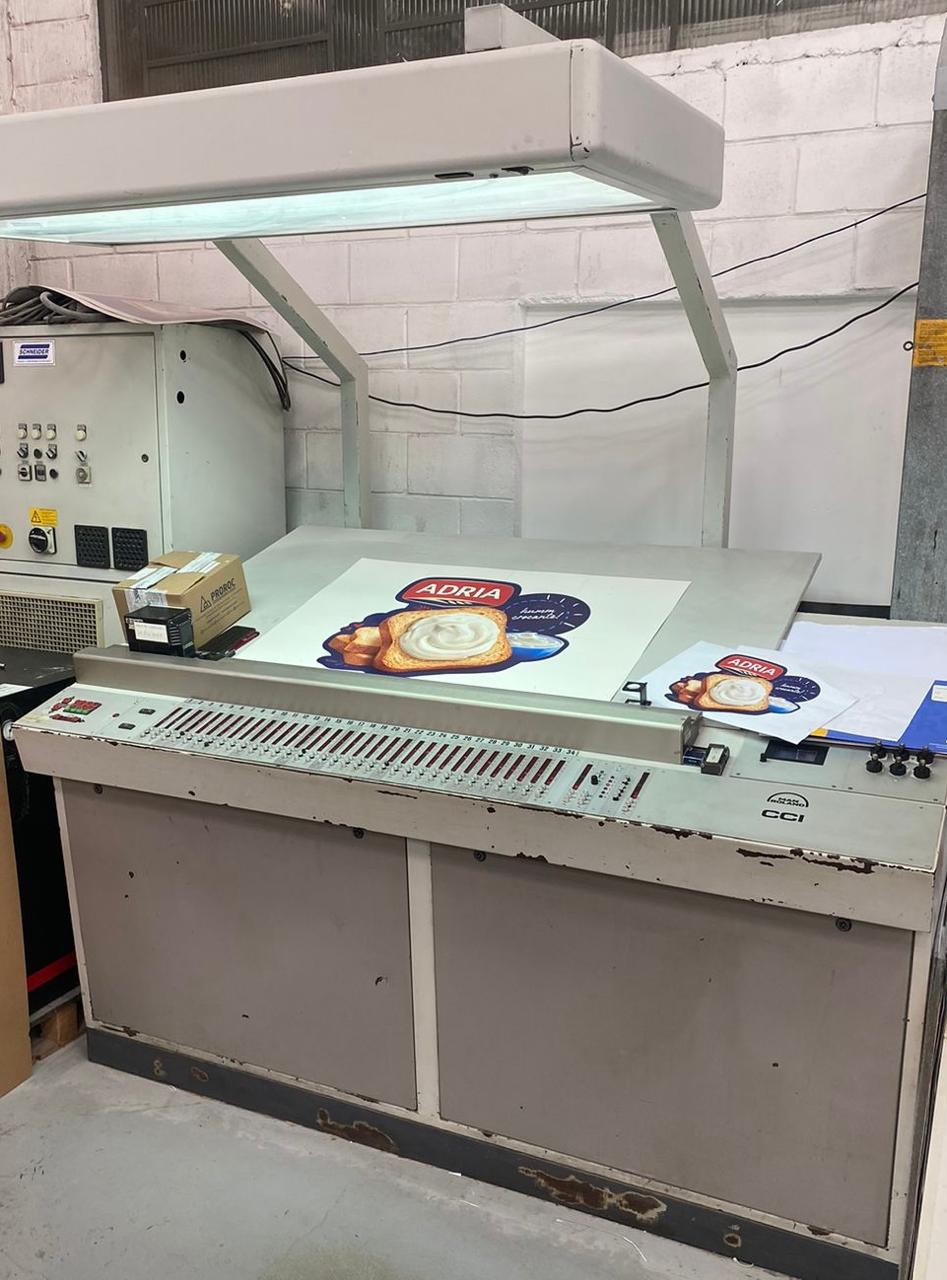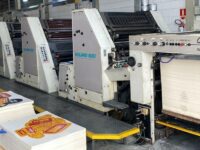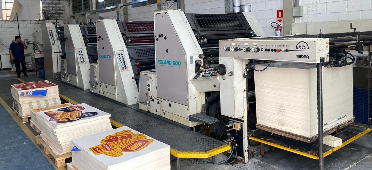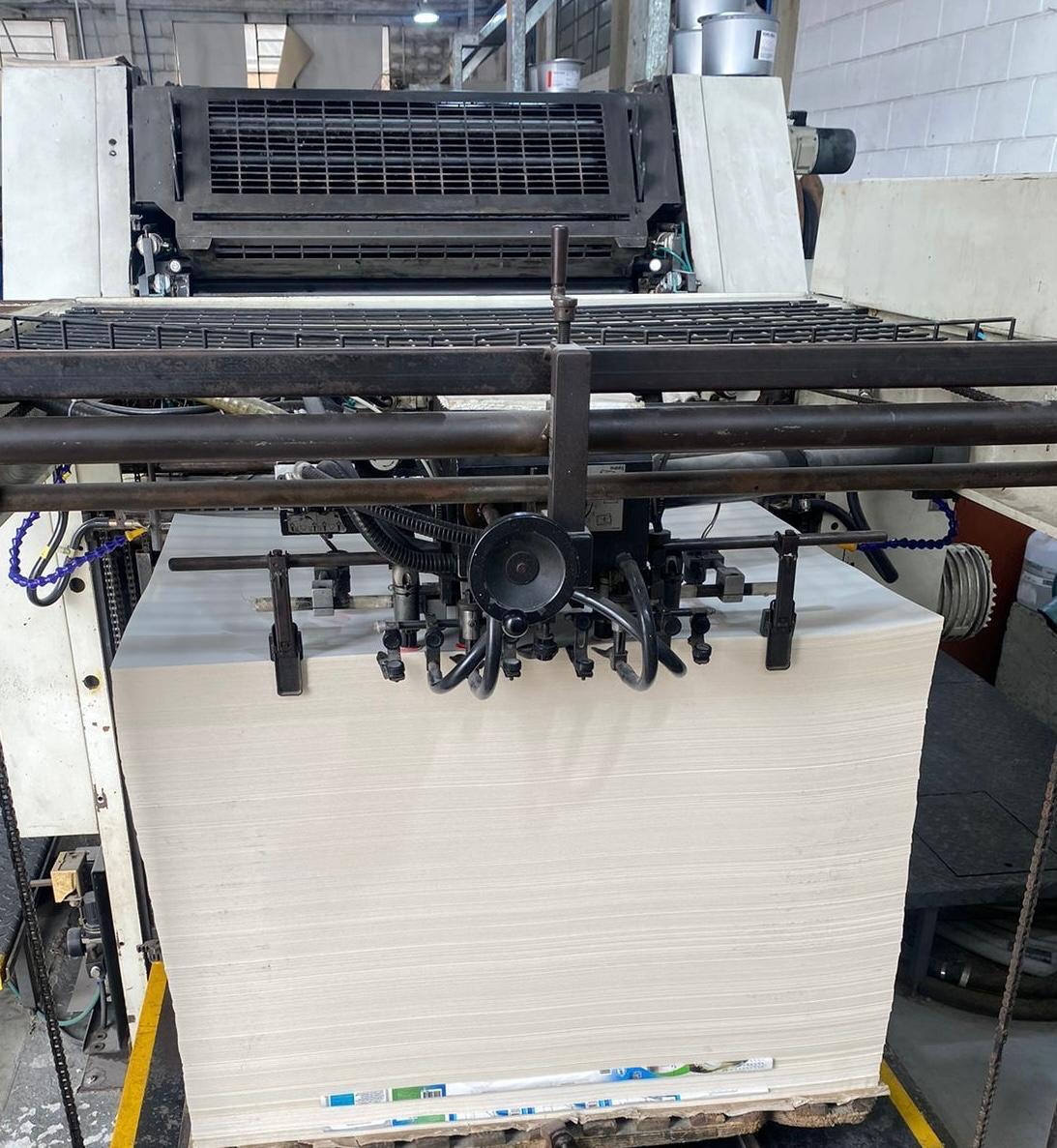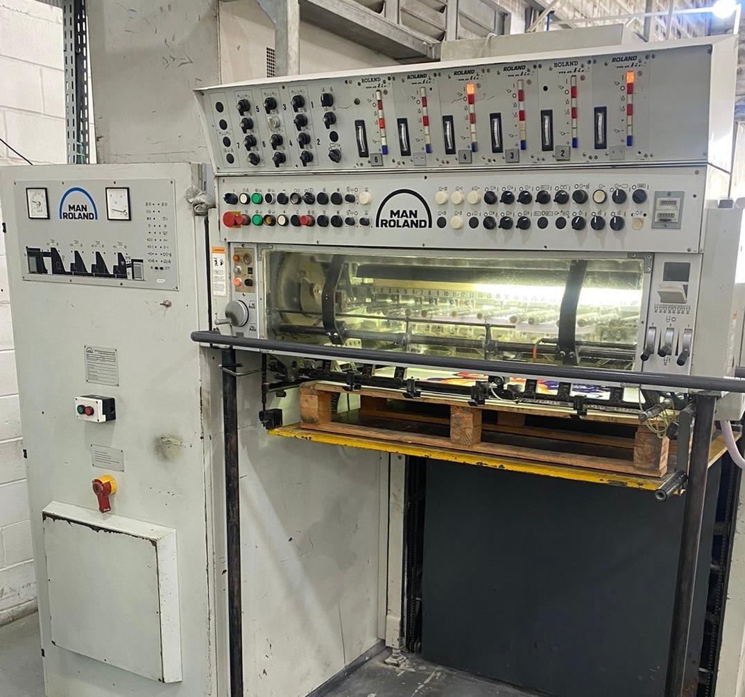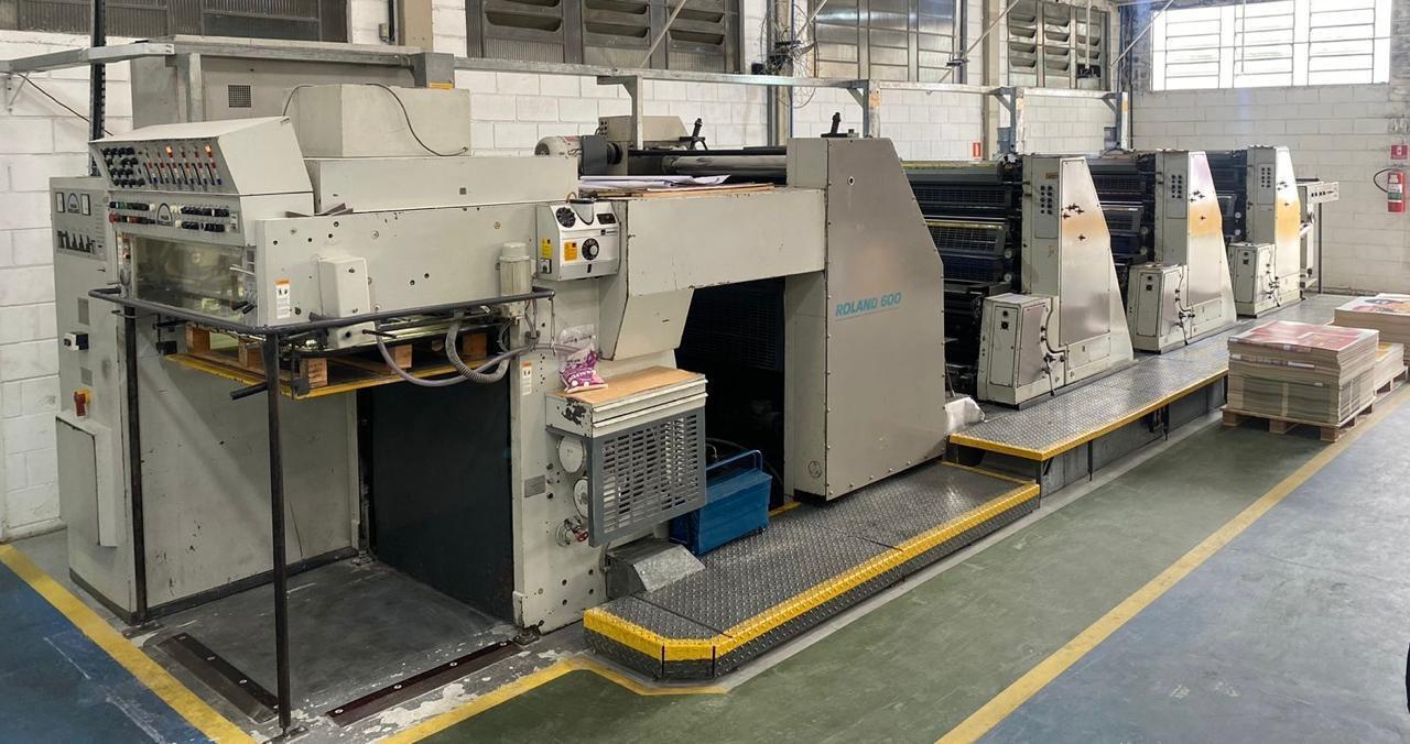 Impressora offset usada, marca Man Roland, modelo 606 LV, ano 1992, 6 cores + verniz, formato 72 x 102 cm, equipada com RCI II – Comando Automático dos tinteiros e registros, secadores IR,  saída estendida, sistema de troca de chapas por régua de aperto rápido, molha RolandMatic com refrigeração e recirculação.
