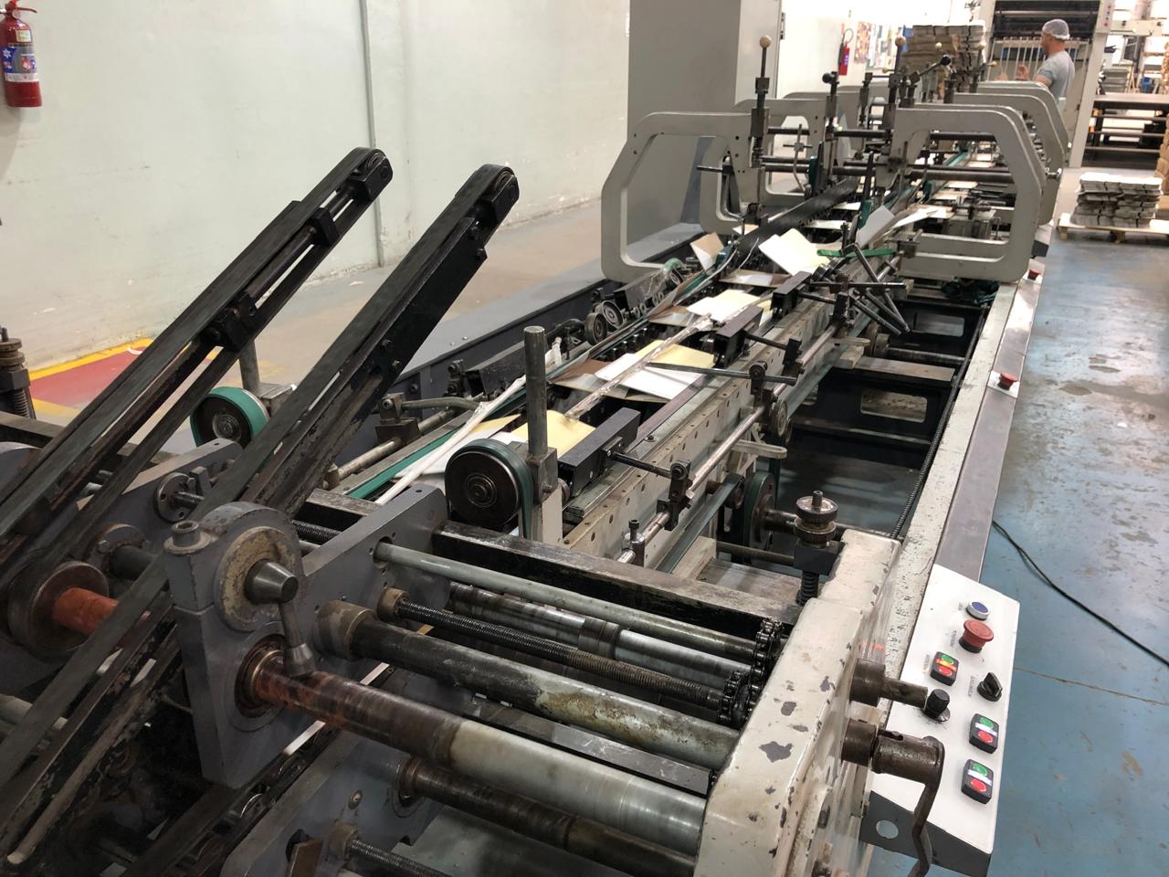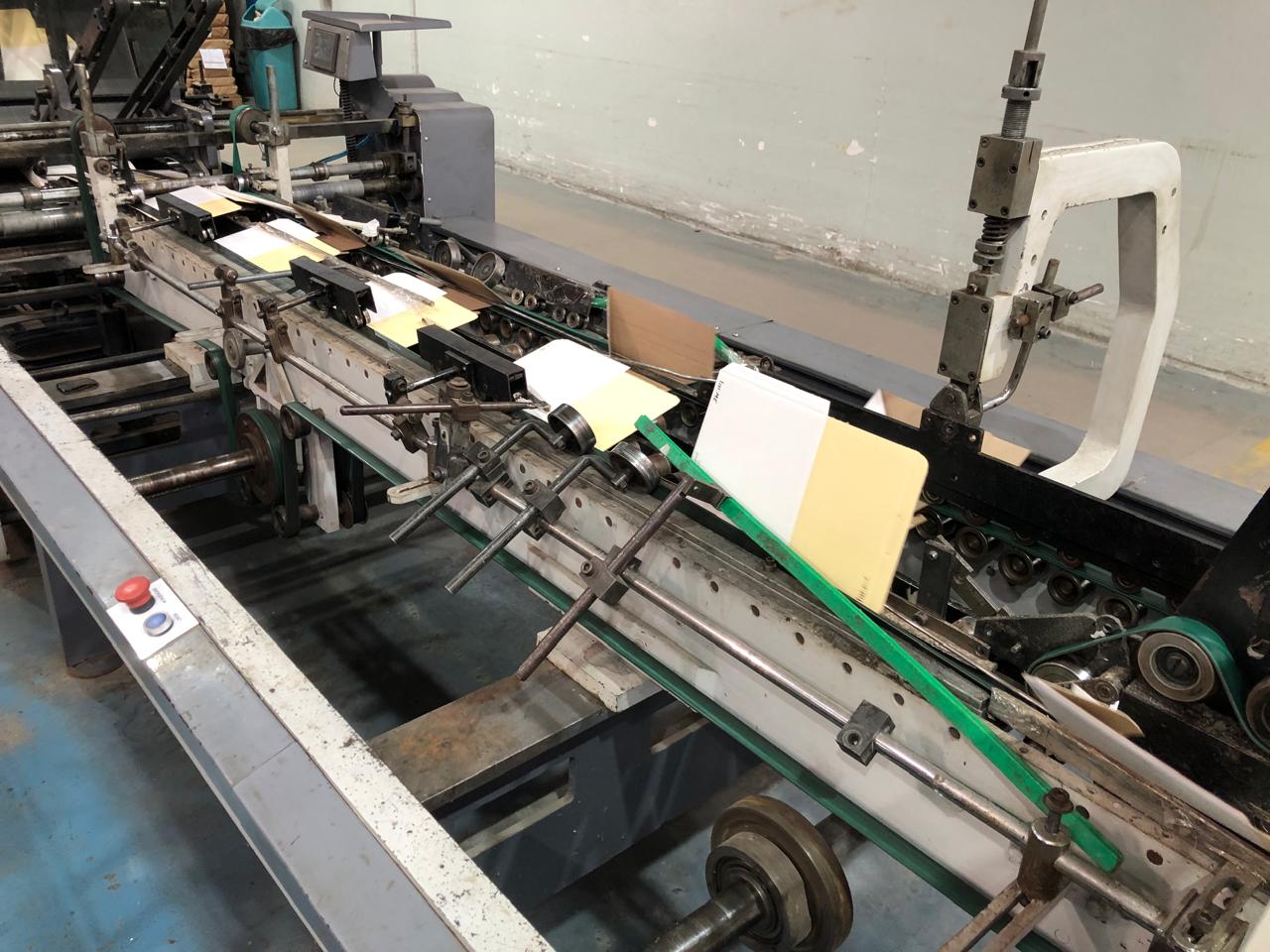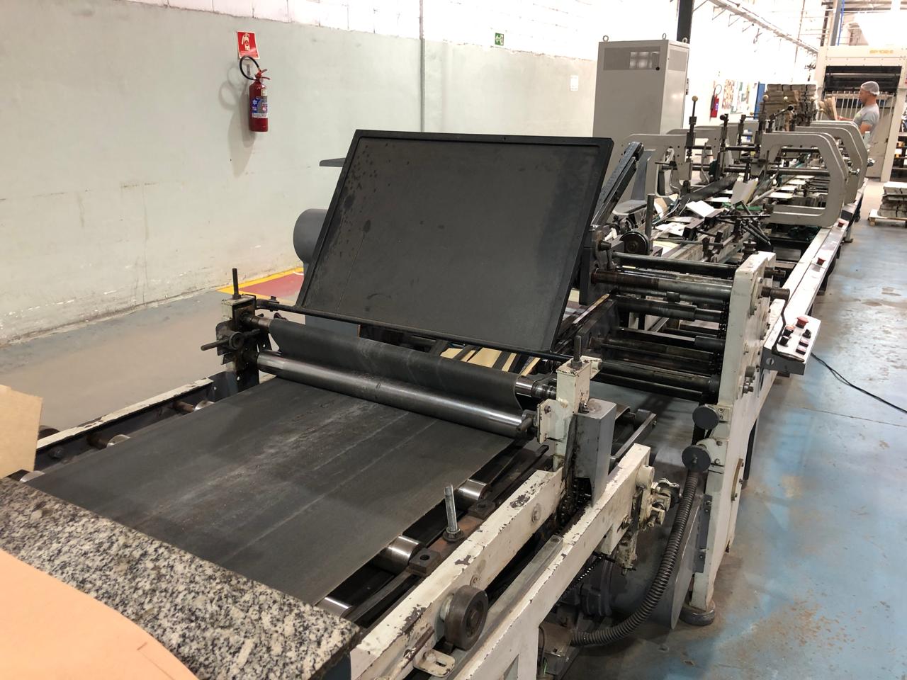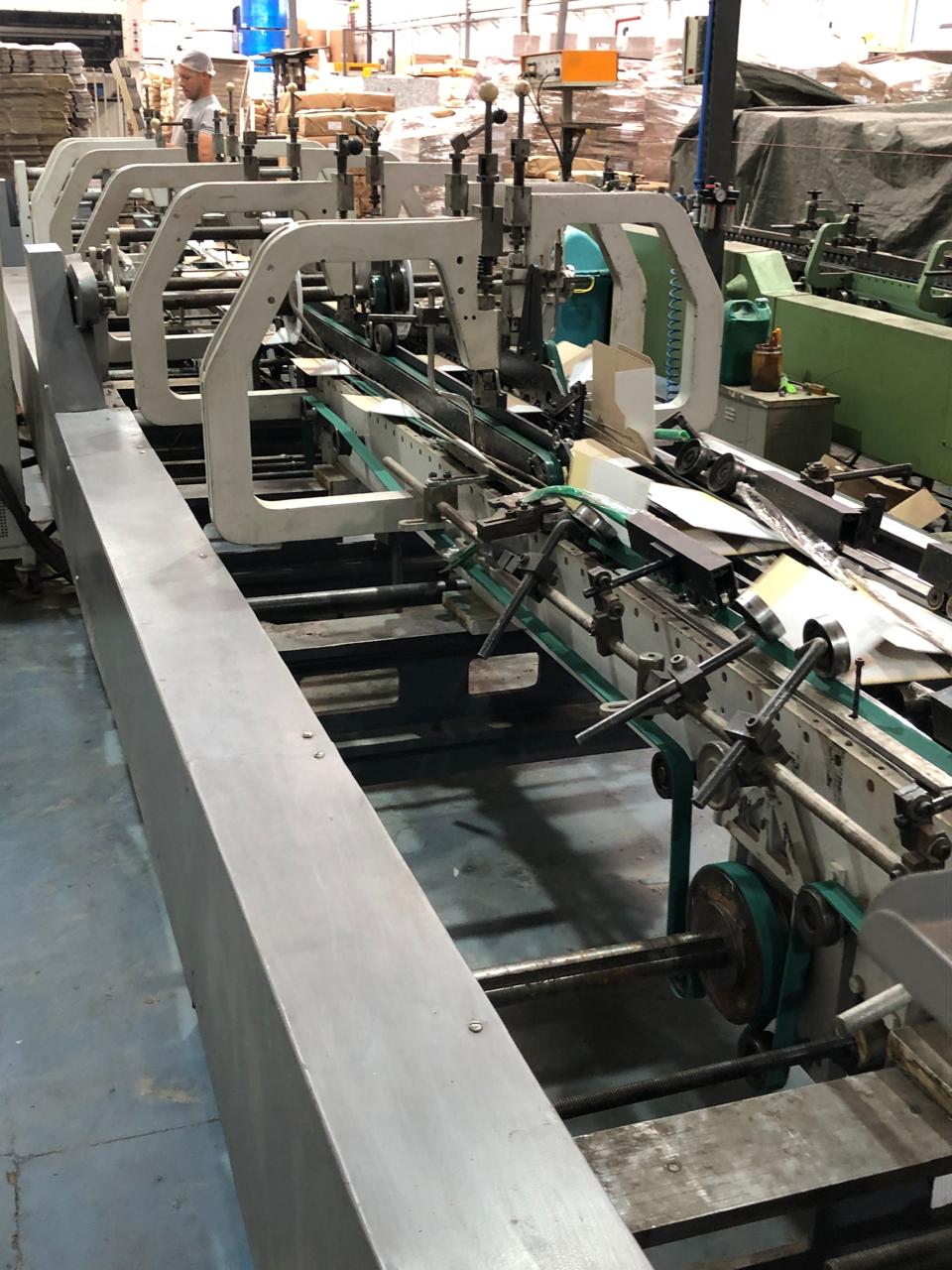 Coladeira de cartuchos usada, marca Ricall, modelo RC 100 PFA, ano 1990, formato máximo 1100 mm, formato mínimo 540 mm, cola lateral, fundo automático, abas duplas, velocidade máxima 230 m/min., vibrador na entrada, único dono, com catálogo, em produção.