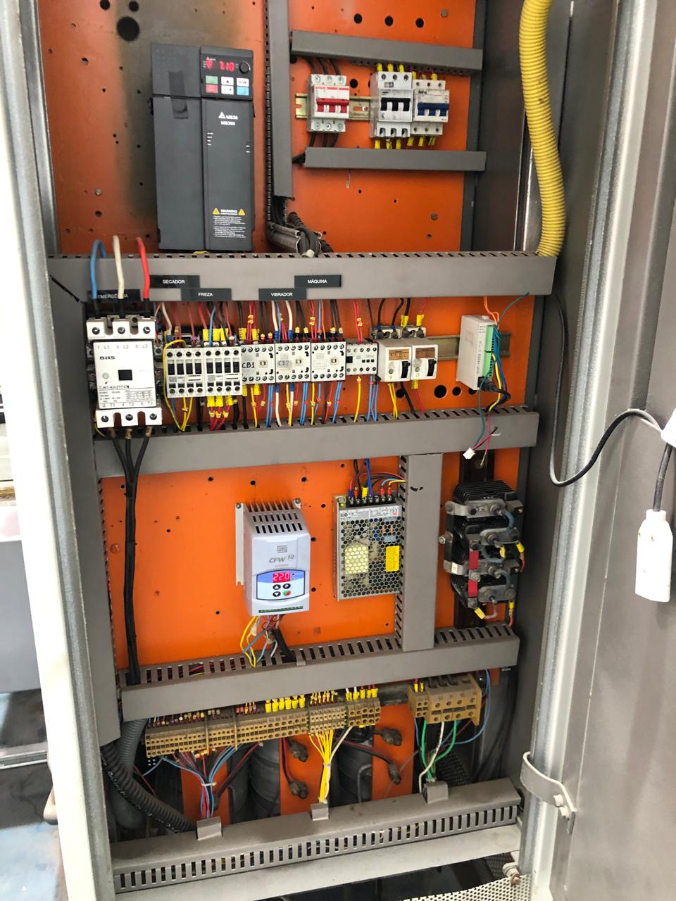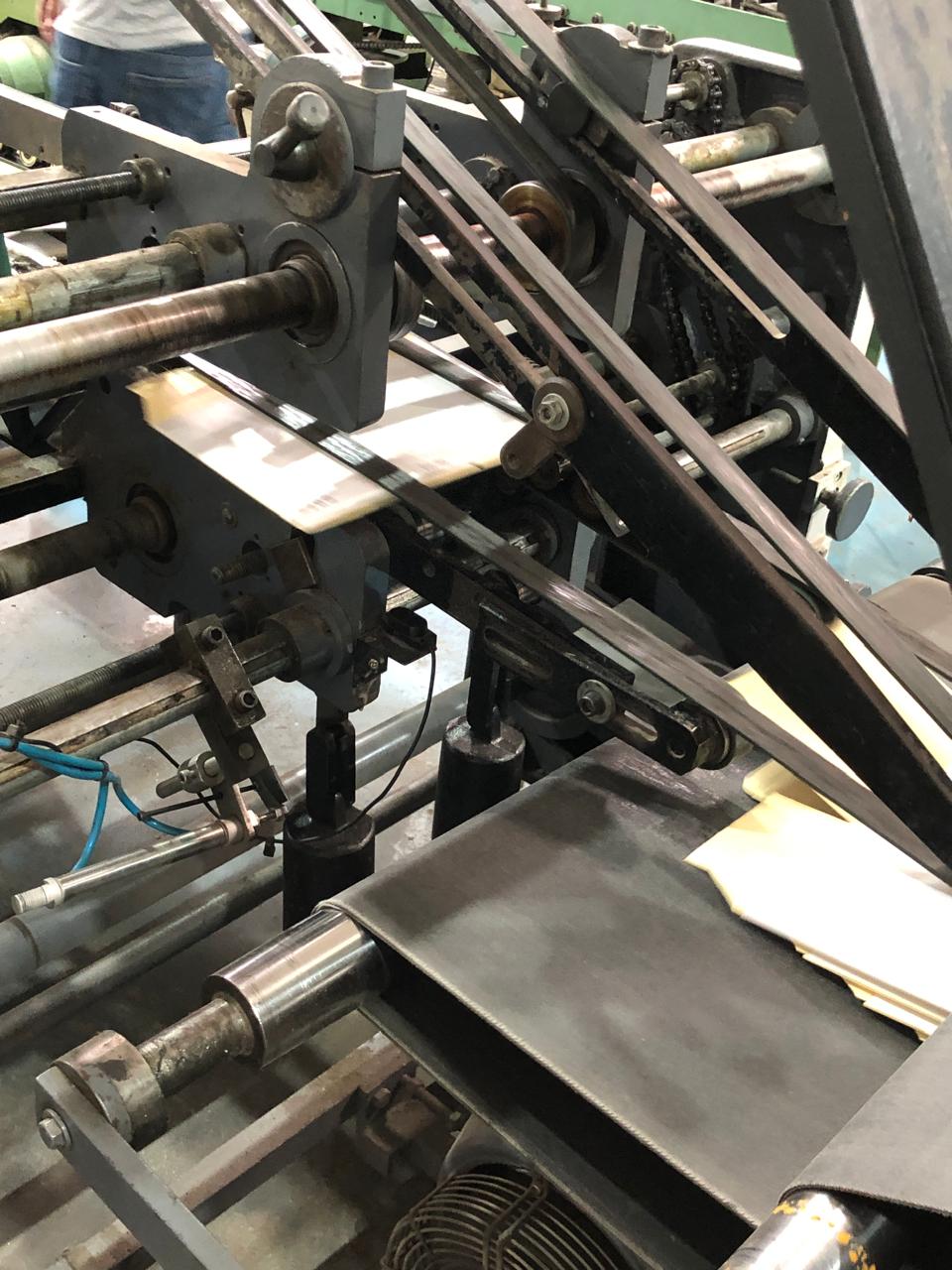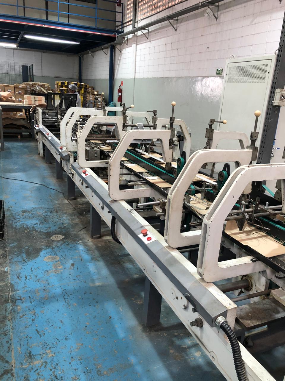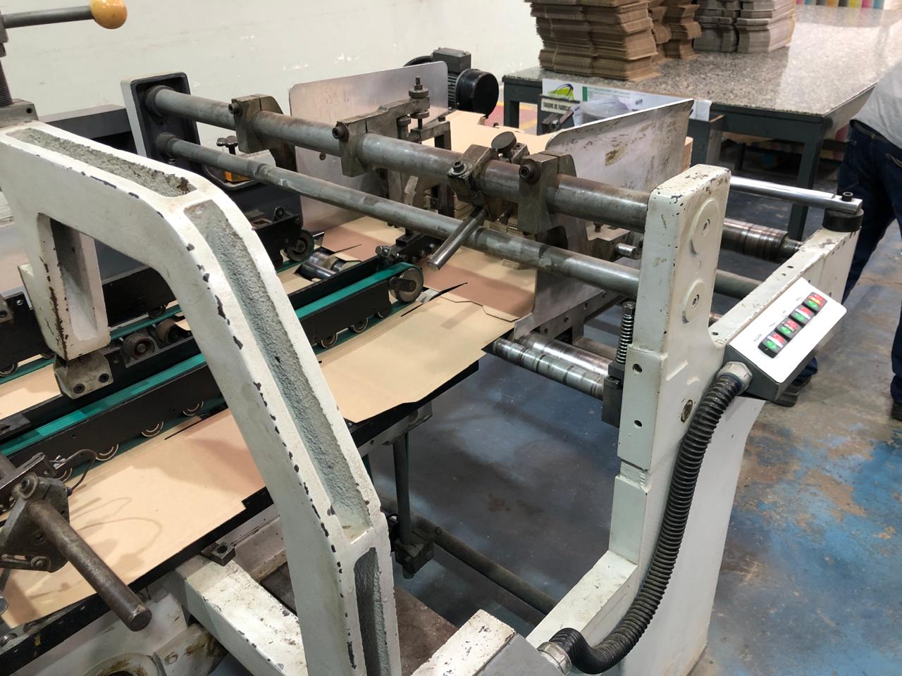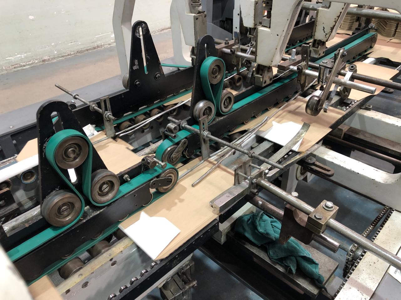 Coladeira de cartuchos usada, marca Ricall, modelo RC 100 PFA, ano 1990, formato máximo 1100 mm, formato mínimo 540 mm, cola lateral, fundo automático, abas duplas, velocidade máxima 230 m/min., vibrador na entrada, único dono, com catálogo, em produção.