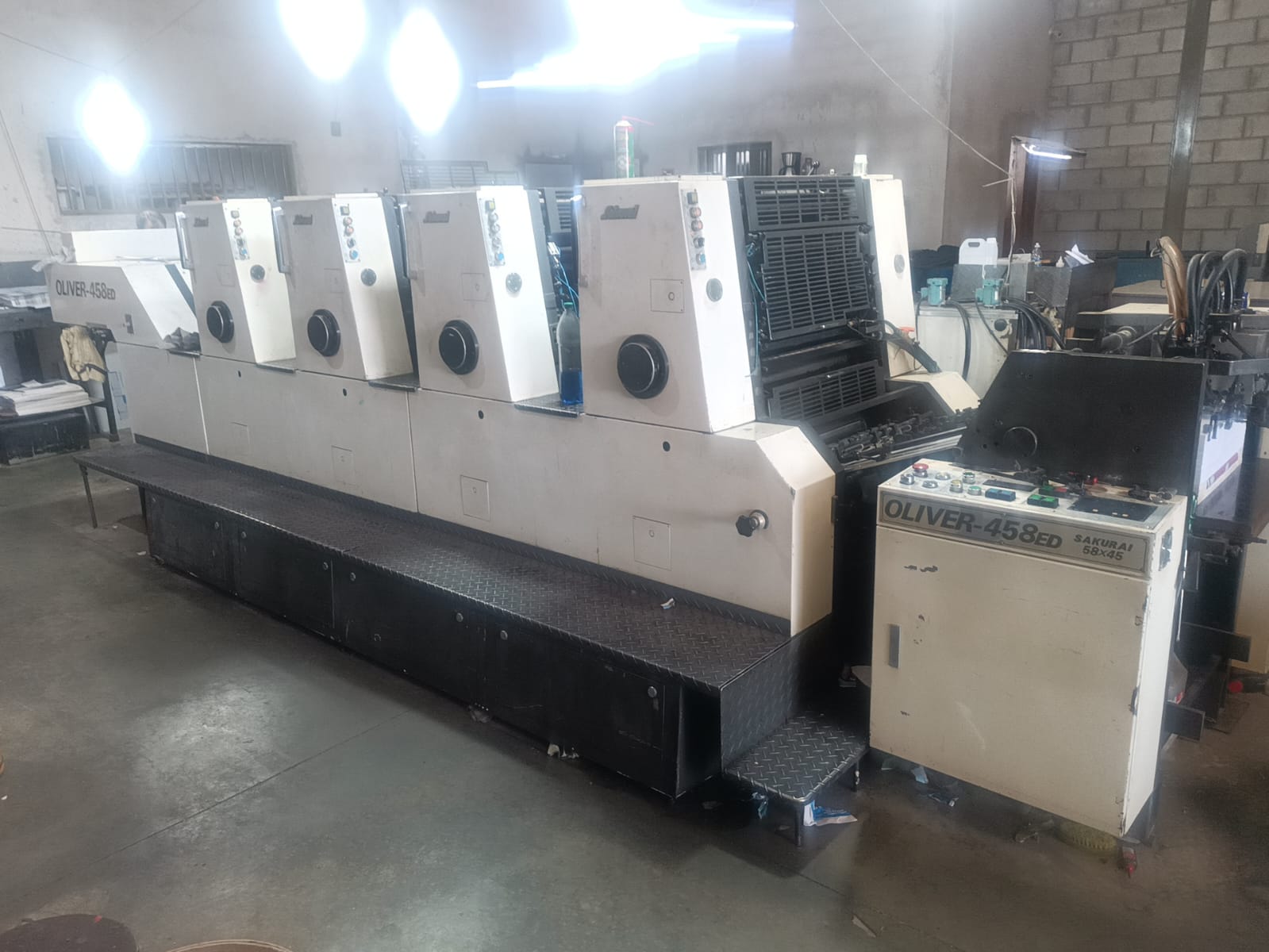 Impressora offset usada, marca Sakurai, modelo Oliver 458 ED, ano 2000, 4 cores, formato 450 x 580 mm, equipada com SCC controle de tinteiros e registros, SAPC-semi auto plate change, molha Olivermatic, pilha alta na saída.